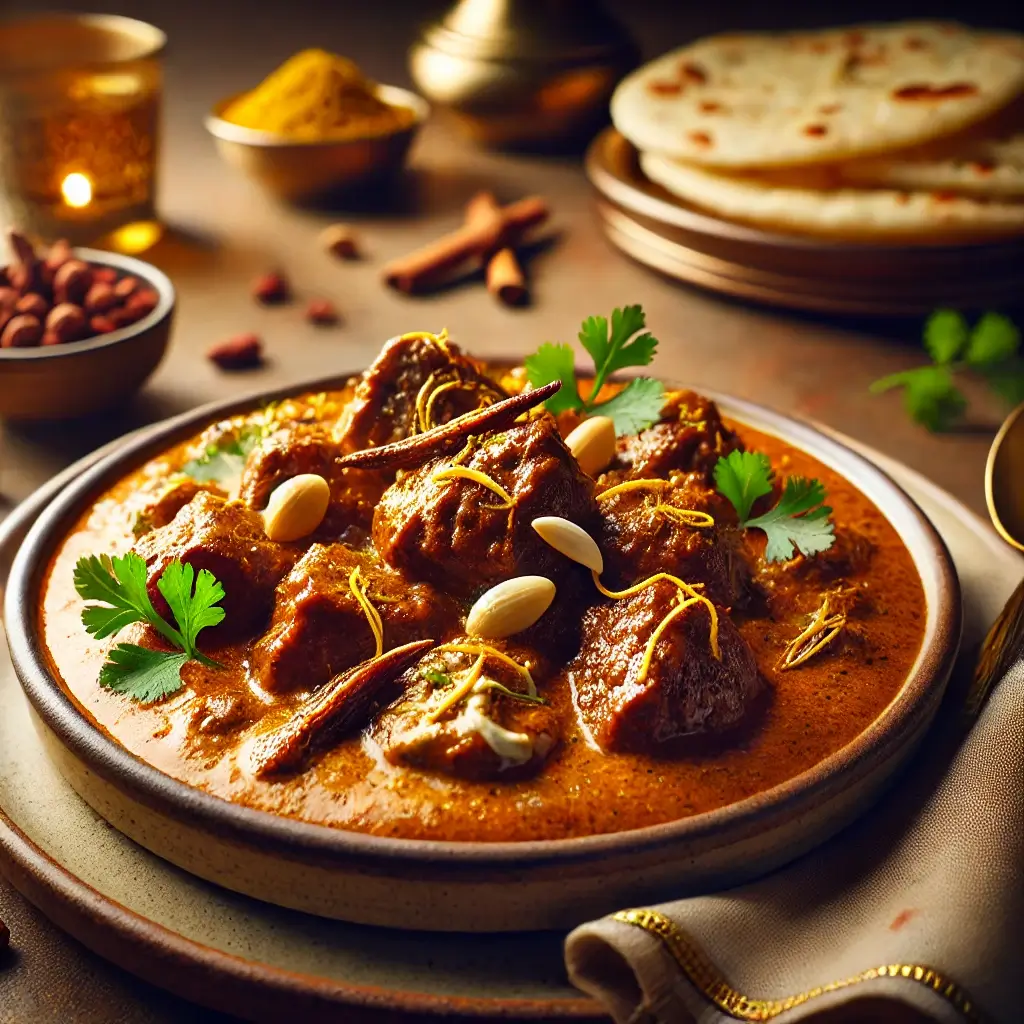 Awadhi (Lucknowi) mutton korma: is a regal, slow-cooked dish from the royal kitchens of Lucknow, in an aromatic gravy of yogurt, cream, saffron, and delicate spices